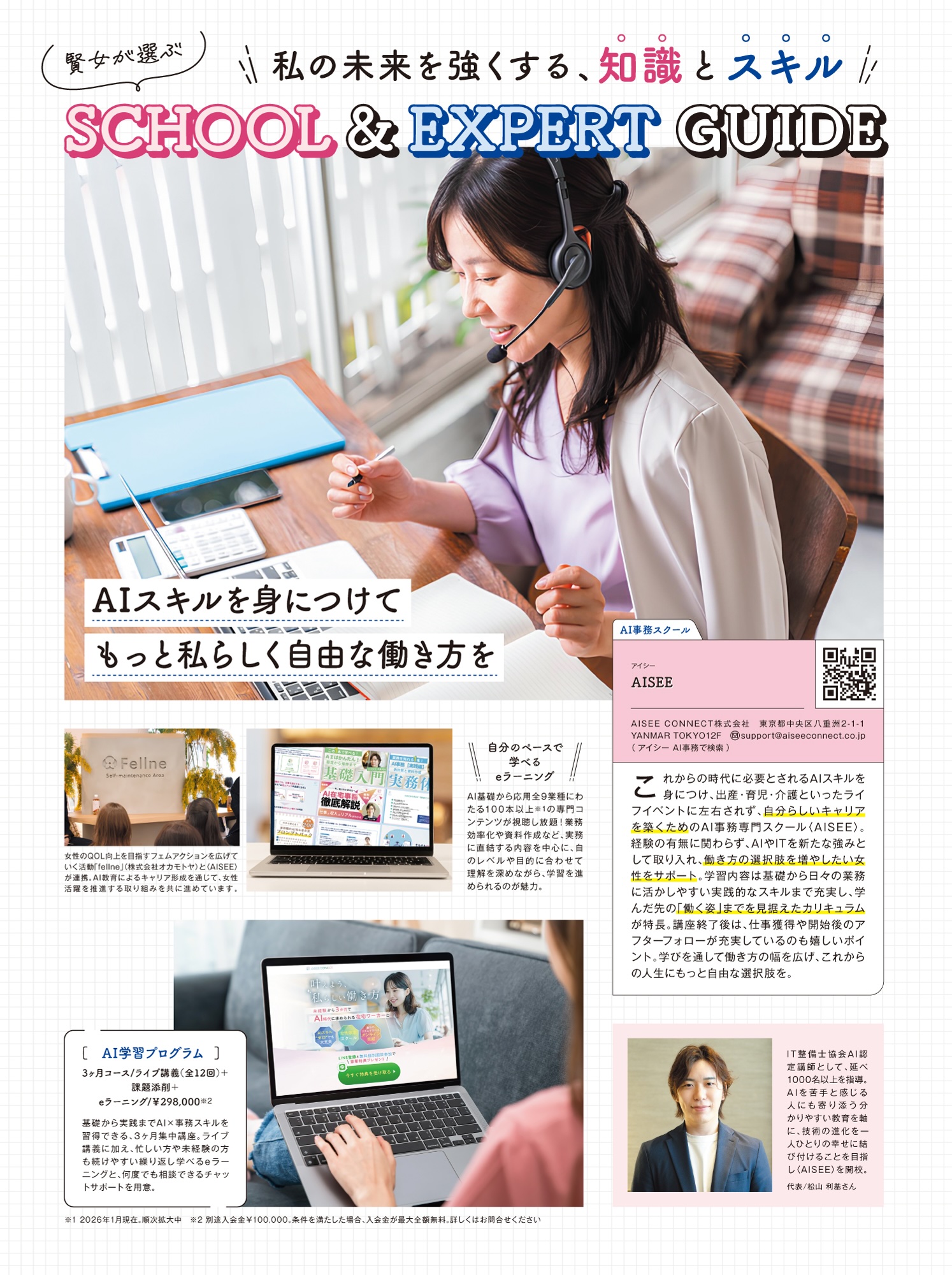 本号では、【新・お金の増やし方戦略】をテーマに、働く女性におすすめのキャリア・スキルアップ関連のスクールが紹介されており、『女性向けAIスクール AISEE』が紹介されています。